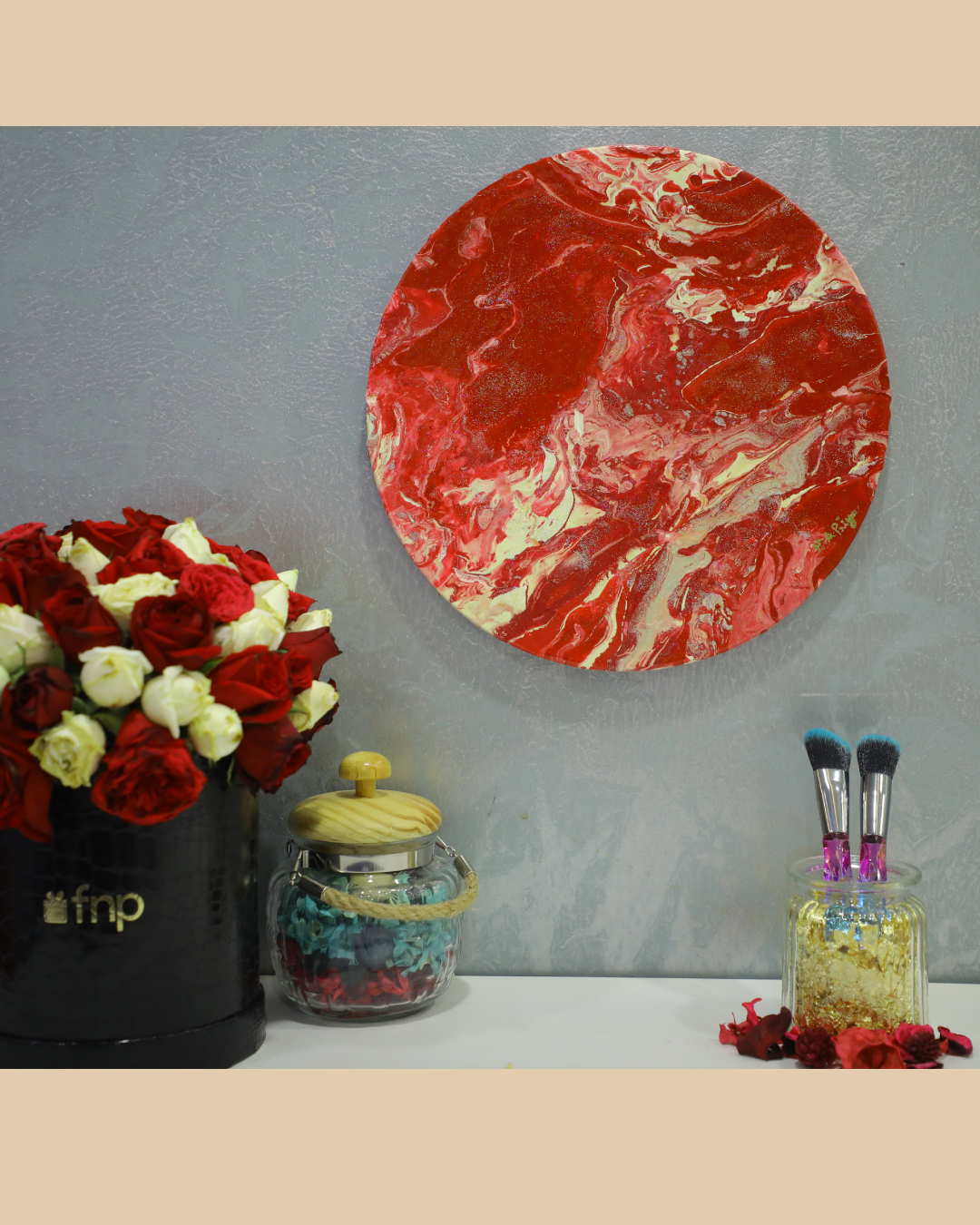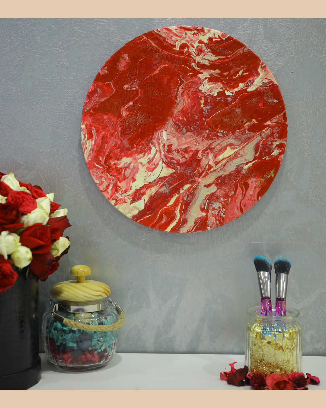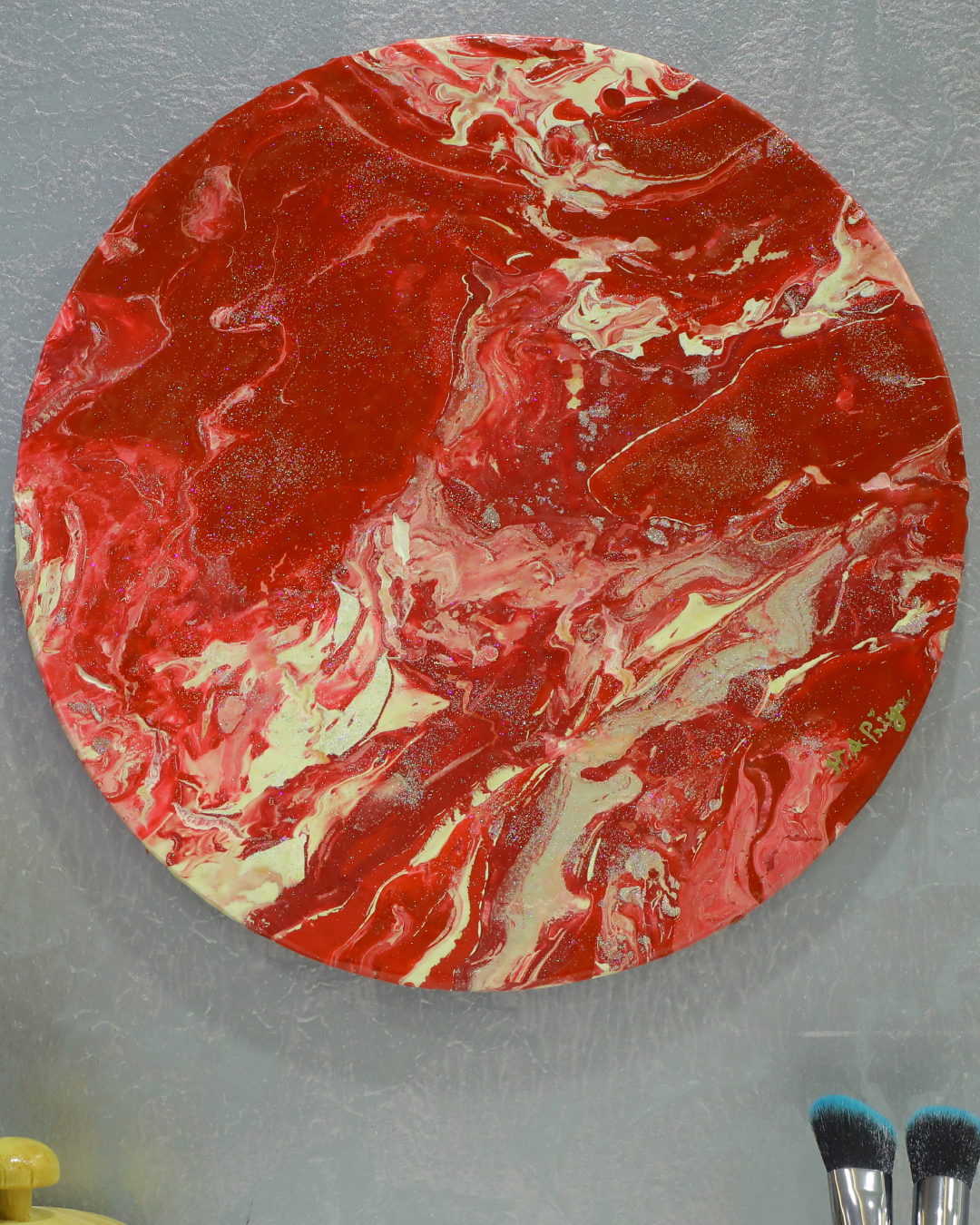 Medium: Fluid Acrylic Paints, Metallic Acrylic Colors, UV Clear Resin, and Unique Glitter. The surface is expertly primed with Gesso and layered with Acrylic paints to add depth and texture.