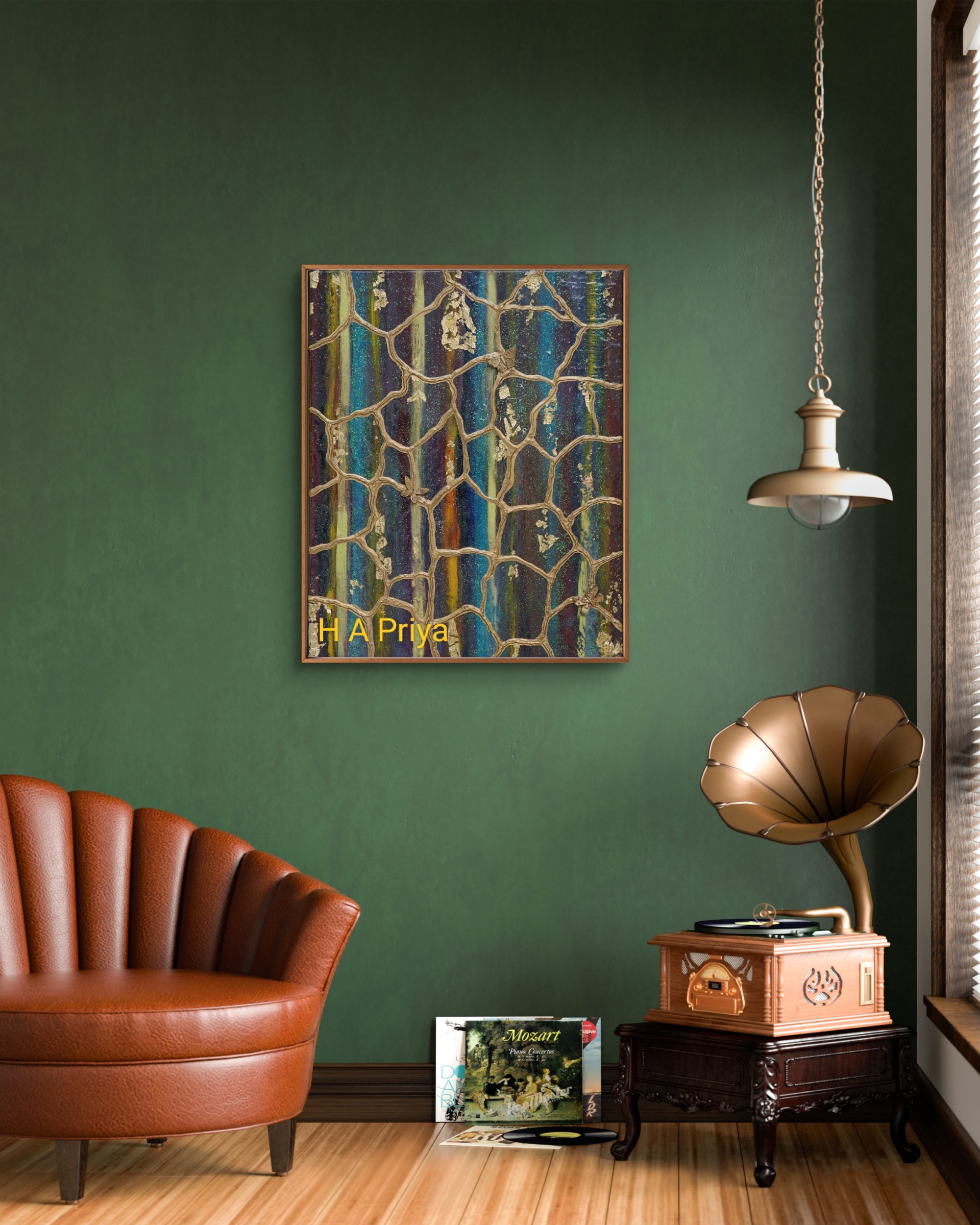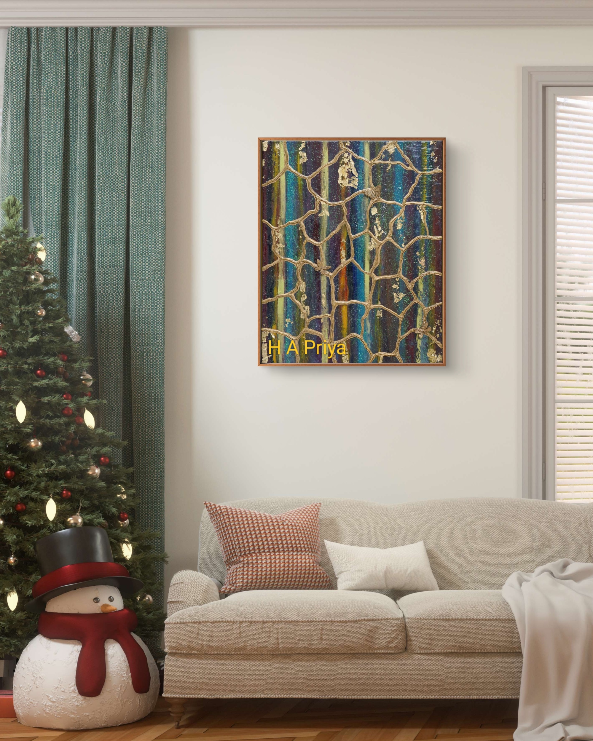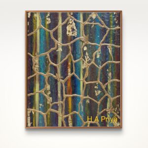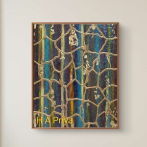 Framing: Encased in a teakwood frame, meticulously primed and finished with gold paint to enhance the artwork’s sophistication.